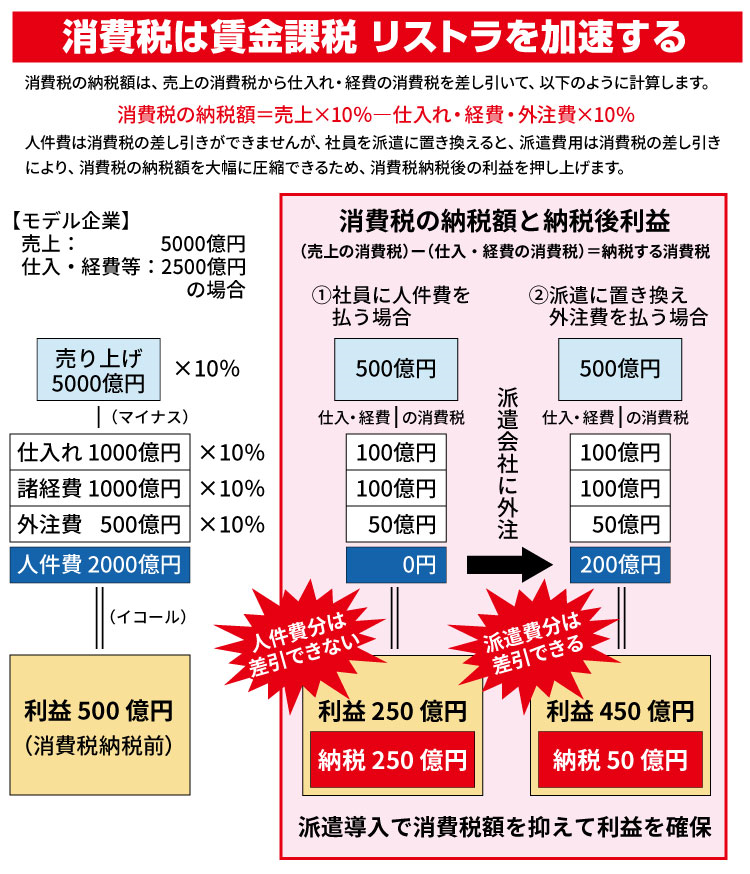 税金を取るための税金になっています。そこで、左図のように、企業は賃金を外注費に変えたりして、