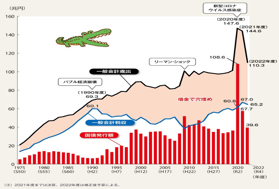 どんどん国債発行(財務省的には借金)が進めばワニの口が開くという図です。