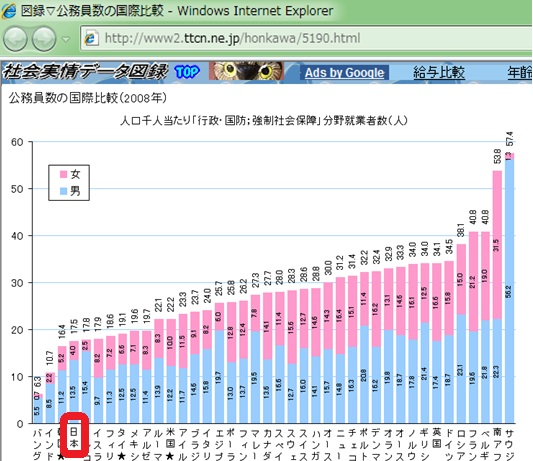 以下のグラフから、日本の公務員数が世界的に見ても非常に少ないことを確認してみて下さい。(2011年に総務省統計局がまとめた資料)