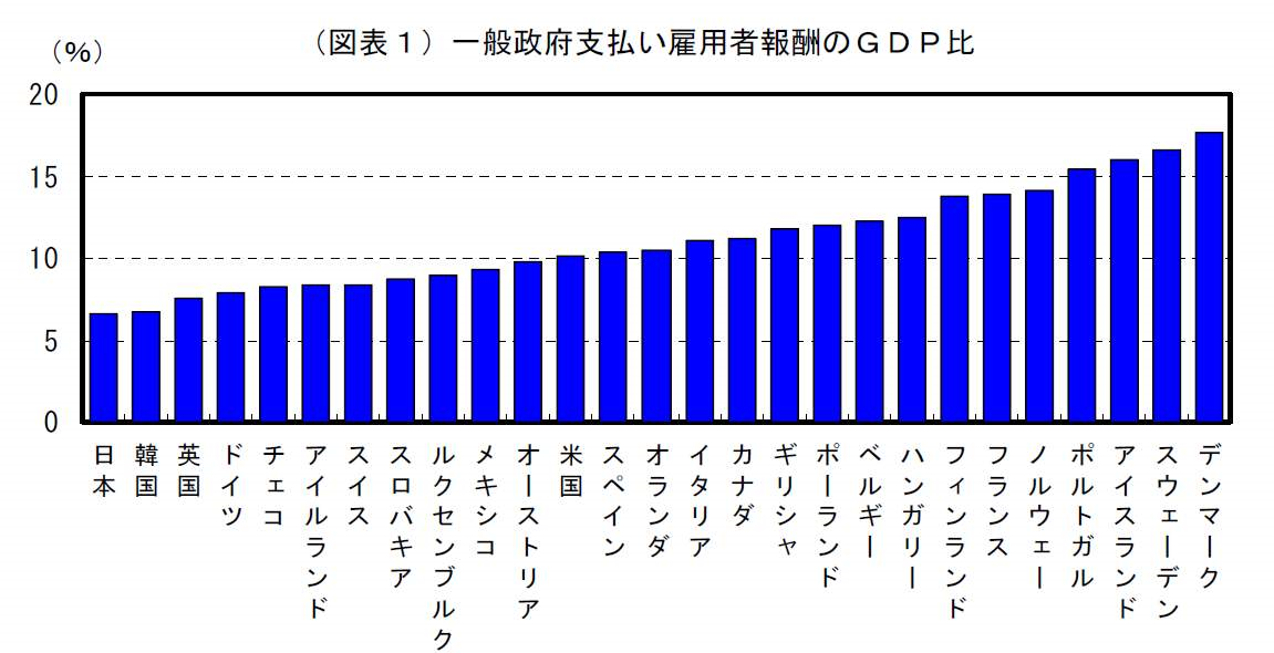 日本の公務員に支払われている給料の対GDP比がどのくらいかも、見てみて下さい。(2005年に大和証券研究所がまとめた資料)